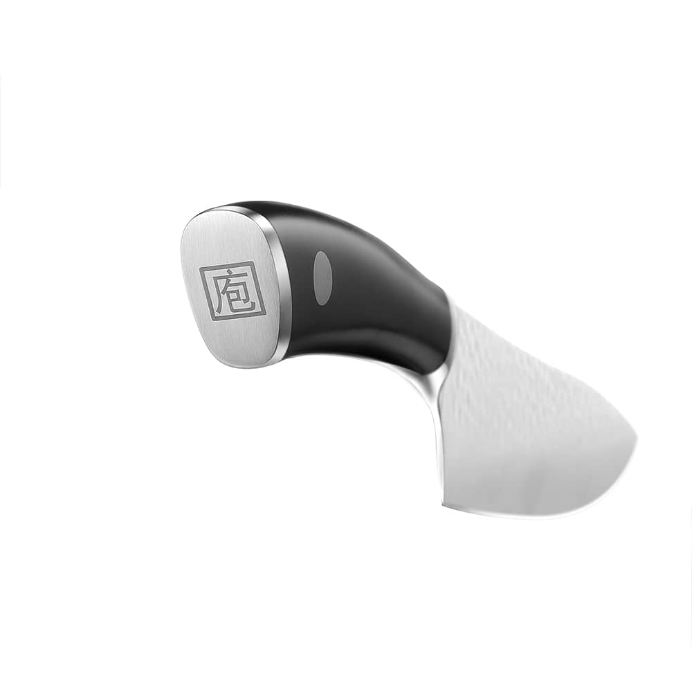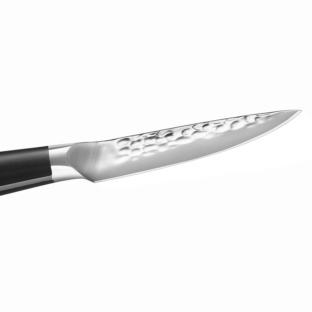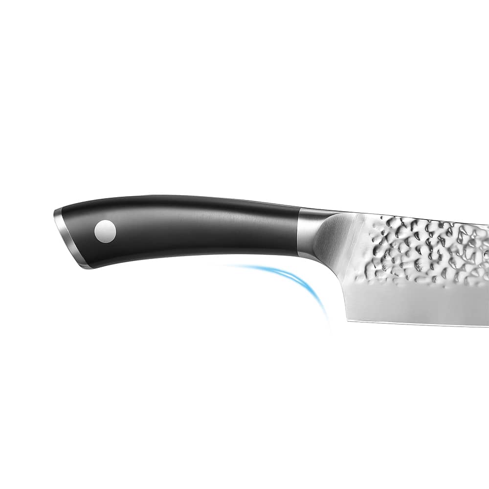 Super Sharp: With ultra sharp edge you can easily handle your daily kitchen work. It effortlessly sliced through tomatoes and cut carrots, you barely had to use any pressure. The hammered blade is a very practical design that reduces resistance and minimizes adhesion on food. With this knife cutting meat, fruit and vegetables like a breeze!