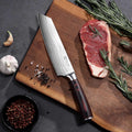 - ERGONOMIC PAKKAWOOD HANDLE: The 8 inch Santoku knife features an ergonomically designed handle that naturally fits into the palm, reducing fatigue during prolonged use. Additionally, Pakkawood handle material is safer, non-slip, and durable